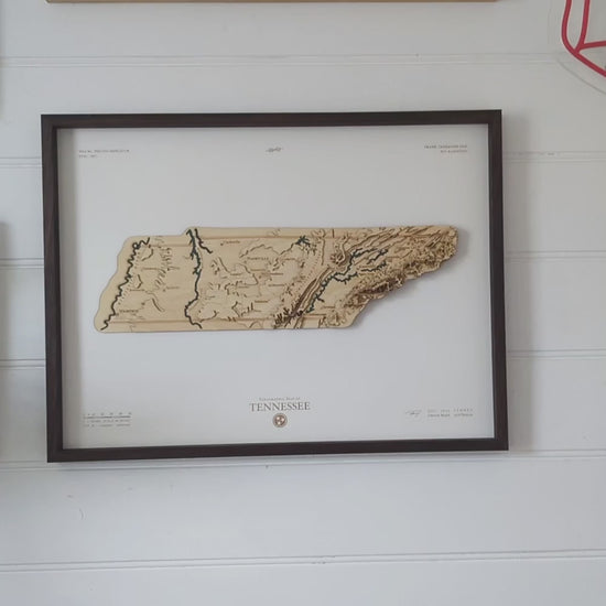 Wooden map art of the state of Tennessee, bordered by the Great Smokies in the east, and the Ol' Man River to the west. This piece captures the beauty of the state and highlights some of the iconic cities like Nashville and Memphis.