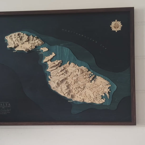 Wooden map art of Malta. This piece comes framed and ready to adorn your walls, so let this art transport you to the crossroads of cultures and civilizations.